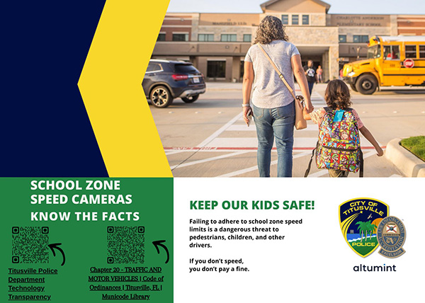 Safety Notice: March 1st, a new automated school-zone speed cameras are rolling out in Titusville. They will be giving out citation for vehicle's speeding through school zones. Learn how the enforcement works and how it will to keep our community safe. Read More...